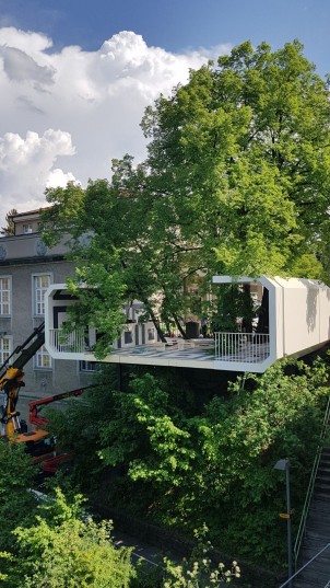 Module #5 ist eine begehbare Skulptur und räumliche Erweiterung der Kunsthalle und bezieht sich auf Elemente der Innenarchitektur des historischen Baus. Der Umriss mit den abgekanteten Ecken erinnert an den Grundriss des Hauptsaals und die schwarz-weiss gemusterten Fliesen stellen einen Bezug her zum einstigen charakteristischen Plattenboden der Eingangshalle. Die schwebende Plattform umschliesst die grosse Linde und lässt so einen offenen und gleichzeitig geschützten Raum entstehen, der das Panorama auf die Aare und die Altstadt eröffnet. Die räumliche Erweiterung wird für ein Freiluft-Programm mit Konzerten, Lesungen, Flohmärkten und weiteren Veranstaltungen genutzt.